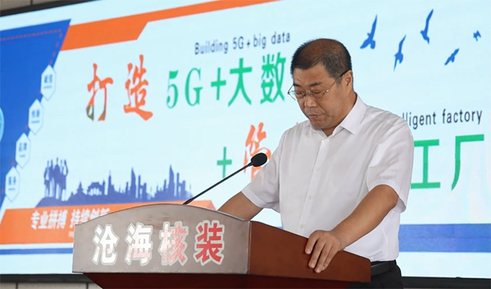 潘佳庭在致辭時指出,近年來,鹽山縣圍繞產業轉型升級,加快智能化生產管理進程,努力推進管道裝備產業向數字化轉型和智能化提升,實現管道裝備產業智能制造、智慧運行。滄海核裝備科技股份有限公司作為我縣高 端管道制造企業,積極響應政府號召,與國內知名科研院所和運營商合作,謀劃了“5G+大數據+管道智能工廠”項目,該項目的實施將進一步加快推動全縣工業轉型升級步伐,為鹽山經濟社會高質量發展注入新的活力。