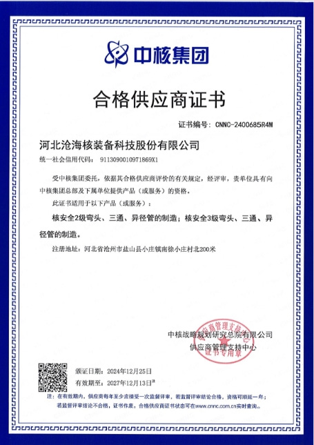 近日,河北滄海核裝備科技股份有限公司成功通過中核戰略規劃研究總院有限公司供應商資格考察評審,正式獲得中核集團合格供應商資質。